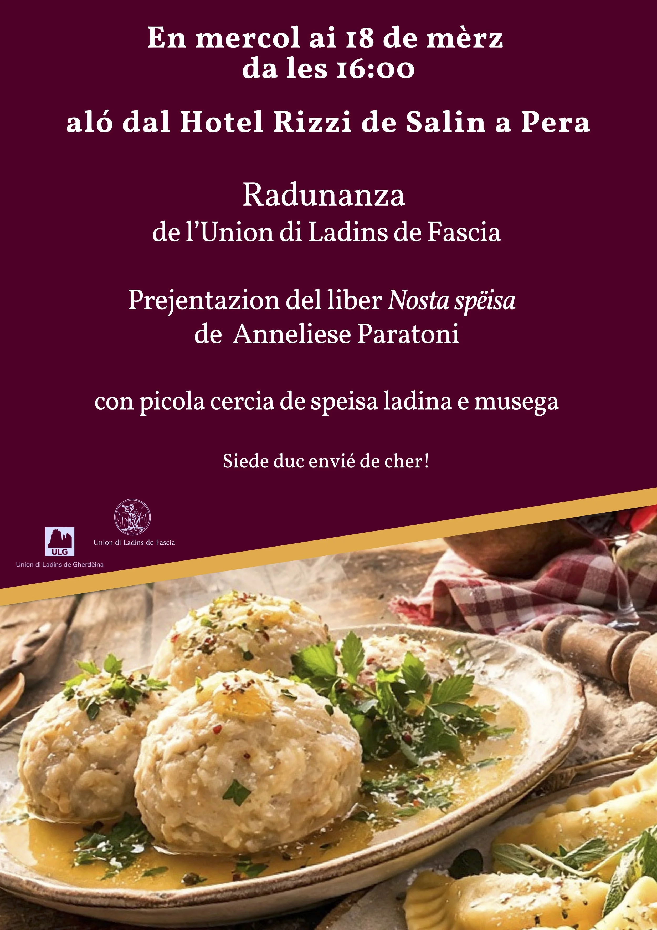 En mercol ai 18 de mèrz da les 16:00 duta la comunanza de Fascia é envièda de cher a la Radunanza de l’Union di Ladins de Fascia ló dal Hotel Rizzi de Salin a Pera.
